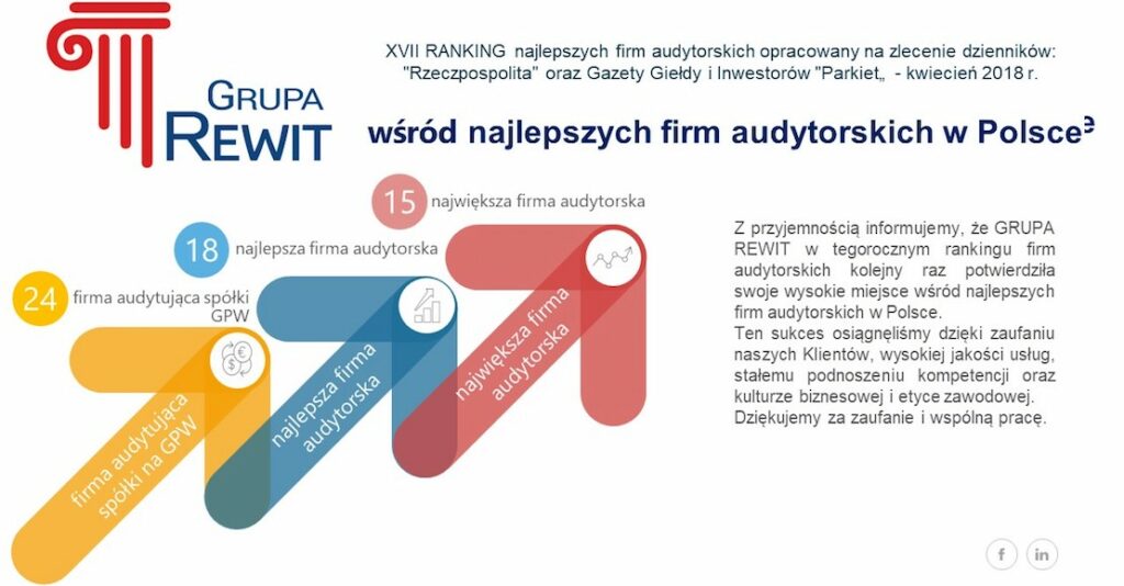 Z przyjemnością informujemy, że w tegorocznym rankingu firm audytorskich, opracowanym na zlecenie dzienników „Rzeczpospolita” oraz Gazety Giełdy i Inwestorów „Parkiet”, GRUPA REWIT kolejny raz potwierdziła swoje wysokie miejsce wśród najlepszych firm audytorskich w Polsce. Ten sukces osiągnęliśmy dzięki zaufaniu naszych Klientów, wysokiej jakości usług, stałemu podnoszeniu kompetencji oraz kulturze biznesowej i etyce zawodowej.